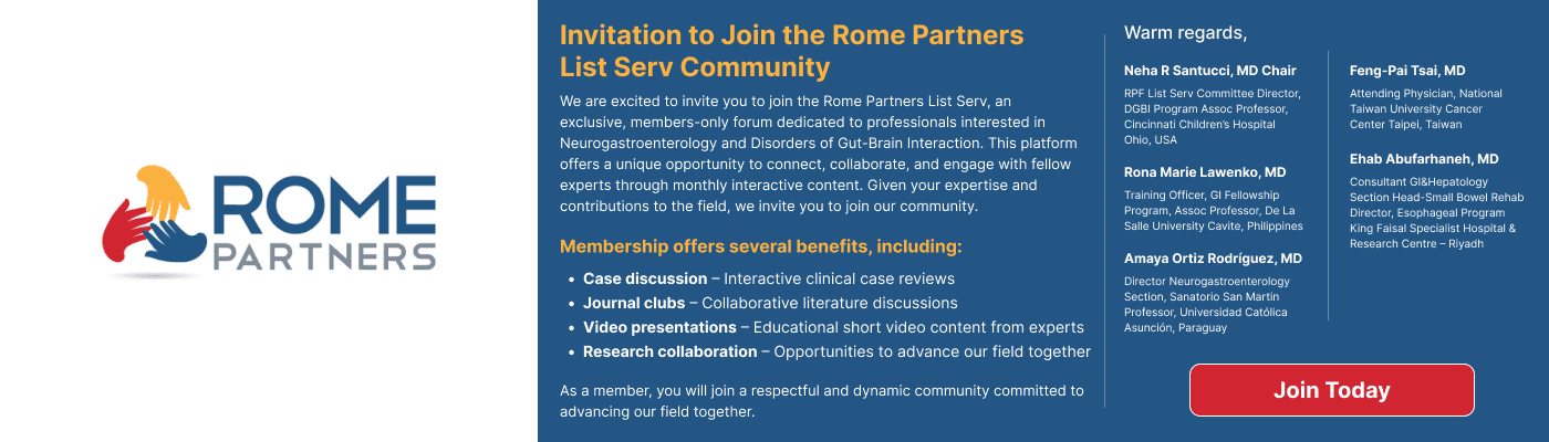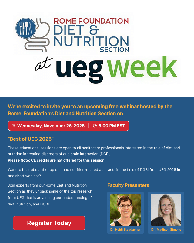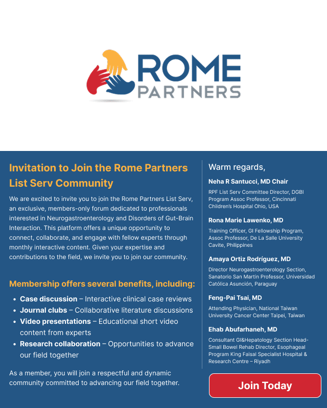 The Rome Foundation is an independent not-for-profit organization dedicated to supporting the creation of scientific data and educational information to assist in diagnosing and treating Disorders of Gut-Brain Interaction (DGBIs), formerly called Functional Gastrointestinal Disorders (FGIDs).